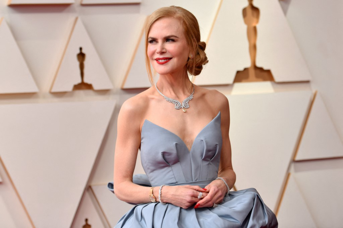خطفت الأنظار الممثلة الأسترالية الأصل نيكول كيدمان البالغة من العمر ٥٦ عاما بفستان وردي فاتح أنيق من دون أكمام، مع صدرية على شكل كورسيه وشق جانبي عال، وارتدت أقراطا متدلية وأساور من الألماس و صففت شعرها في موجات فضفاضة، بينما تم تطبيق ماكياج ناعم مع ظلال عيون وردية وشفتين ورديتين.